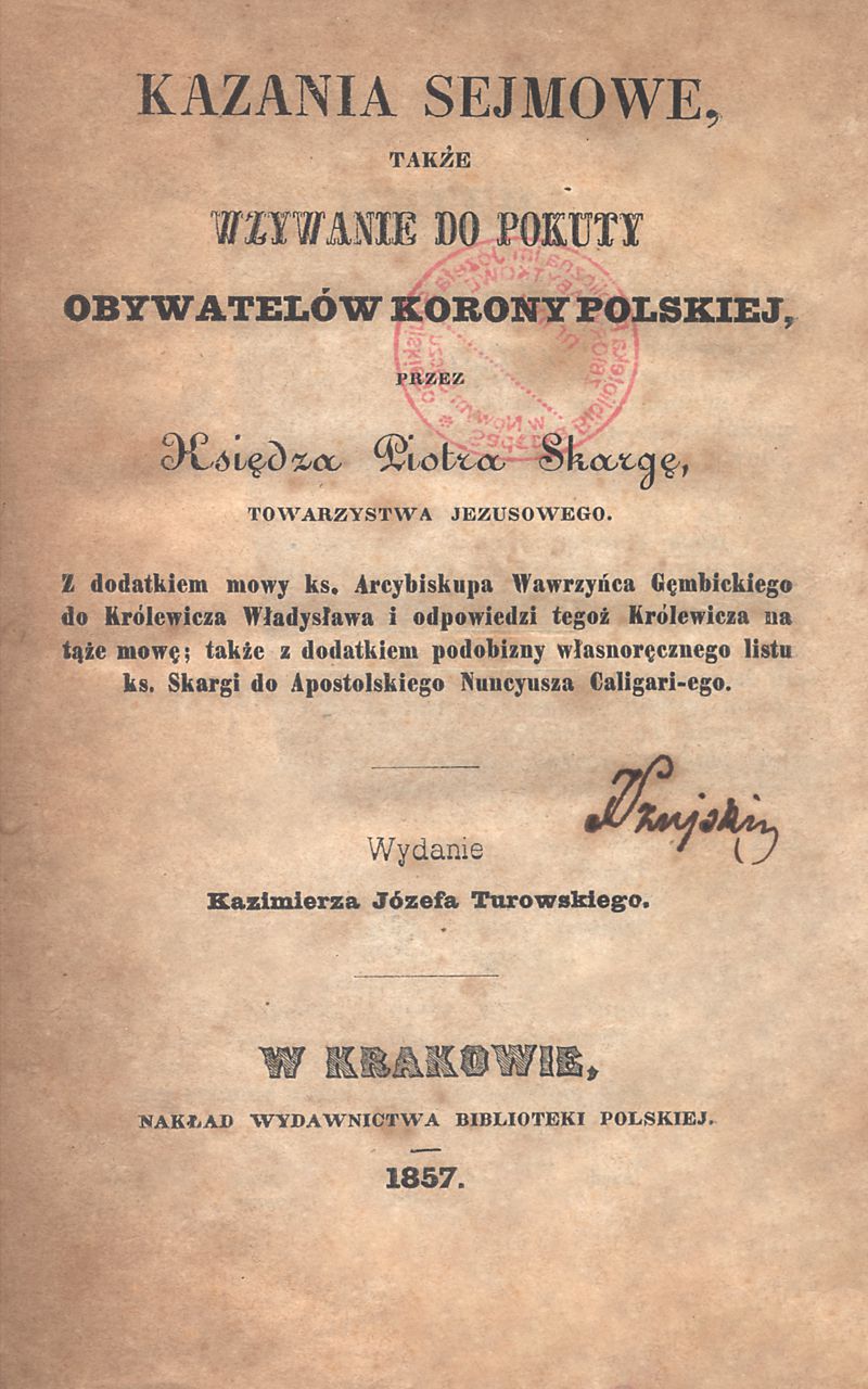 Współoprawne z: Mowy Stanisława Orzechowskiego / wydanie Kazimierza Józefa Turowskiego. Sanok : nakład druk Karola Pollaka, 1855.