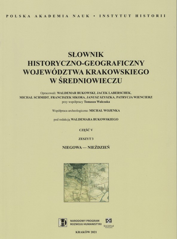 Trzeci zeszyt piątej części "Słownika Historyczno-Geograficznego Województwa Krakowskiego w Średniowieczu" obejmuje następujący zakres haseł: Niegowa – Nieździeń. Słownik obejmuje – w układzie alfabetycznym – hasła dotyczące miejscowości i obiektów fizjograficznych stołecznej prowincji Królestwa Polskiego w jej przedrozbiorowych granicach. W ramach haseł uszeregowane są wszystkie informacje źródłowe na temat danej miejscowości, przede wszystkim o jej ówczesnej przynależności administracyjnej, granicach i warunkach geograficznych, stosunkach własnościowych, lokacjach, przynależności parafialnej i ciekawszych sprawach obyczajowych jej mieszkańców. Chronologiczny zakres słownika wyznaczają z jednej strony pierwsze wzmianki o poszczególnych miejscowościach, z drugiej zaś rok 1530. Zestawiony w słowniku materiał jest w zasadniczym zrębie wyciągiem z ksiąg sądowych grodzkich i ziemskich, znajdujących się w Archiwum Państwowym w Krakowie, oraz z archiwaliów kościelnych. Wydawnictwo to jest niezbędną pomocą naukową w warsztacie badacza późnego średniowiecza i epoki wczesnonowożytnej. W lekturze pomagają mapy i tablice genealogiczne. Słownik opracowano w Instytucie Historii PAN, wydano przy wsparciu finansowym Narodowego Programu Rozwoju Humanistyki.